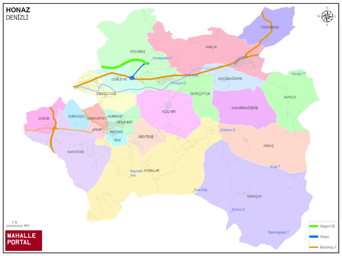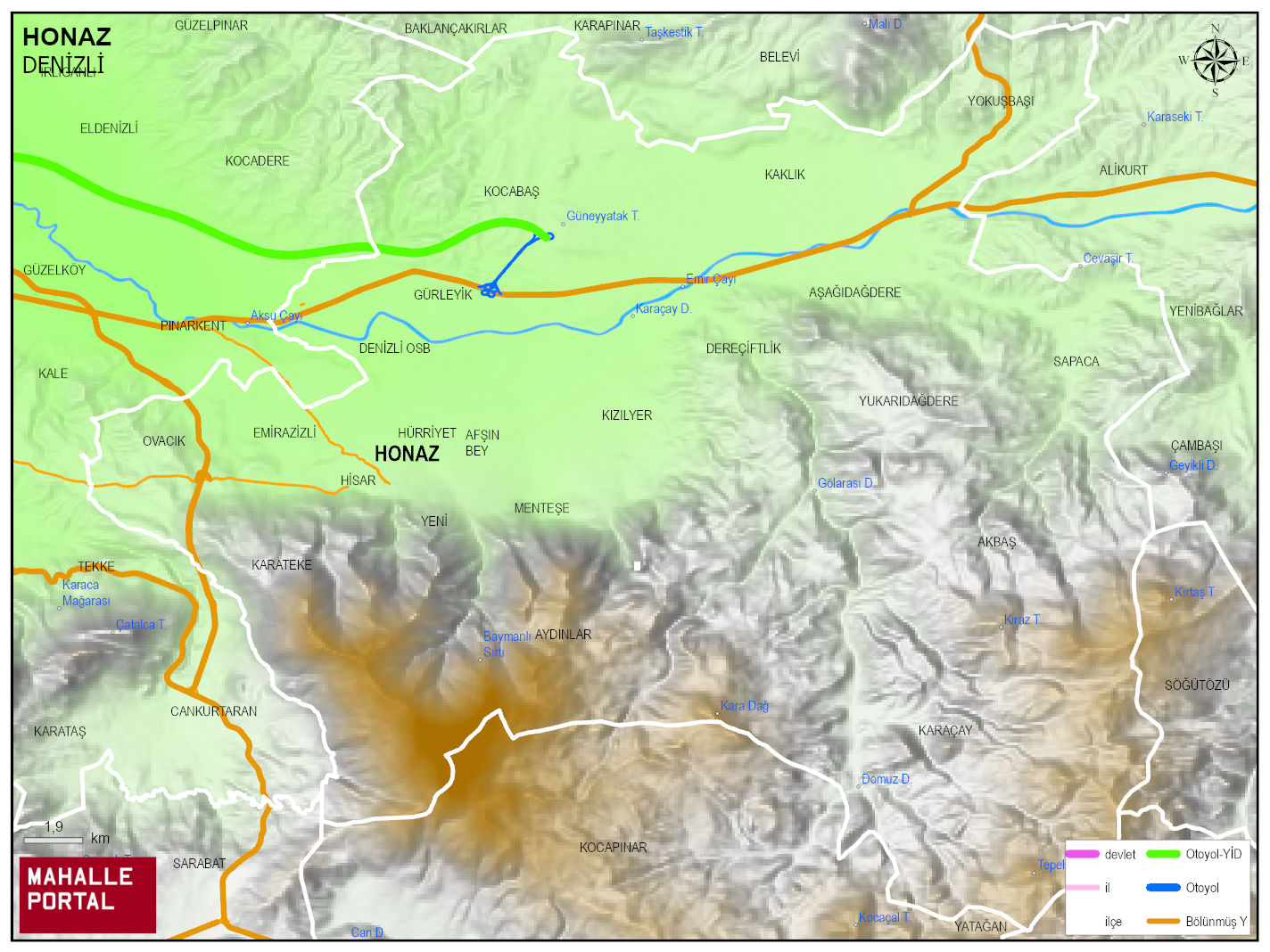 HONAZ, DENIZLI Digital Map | Satellite View and Local Boundaries