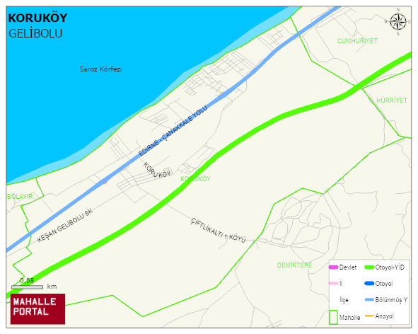 KORUKÖY köyü GELİBOLU ilçesi ÇANAKKALE iline bağlıdır. UAVT (Ulusal Adres Veritabanı Kodu) Köy Kodu: 8467. Posta Kodu: 17502. KORUKÖY 7 adet sokak ve cadde, 75 adet işyeri ruhsatlı bağımsız, 971 adet konut ruhsatlı daire, 161 adet hane barındırır. Bu yerleşimde 308 kişi yaşamaktadır. 160 erkek, 148 kadın. 57 kişi hiç evlenmemiş, 185 kişi evli, 18 kişi boşanmış ve 33 kişinin eşi vefat etmiştir. 60 ve üzeri yaşta insan sayısı 154dir. 60+ kişiler nüfus oranı % 50